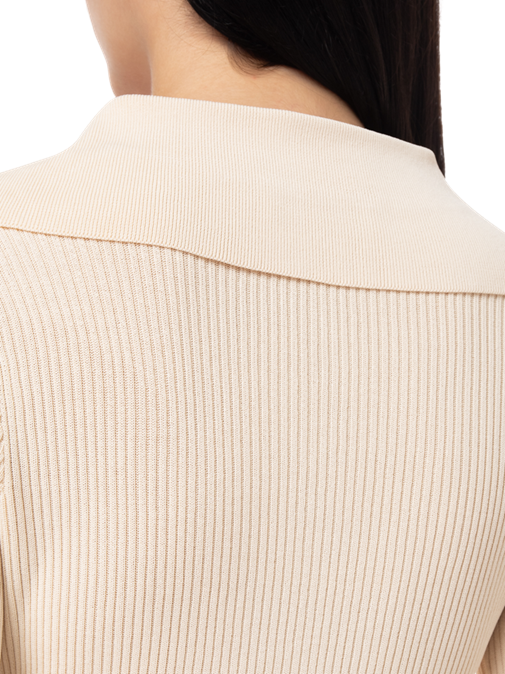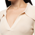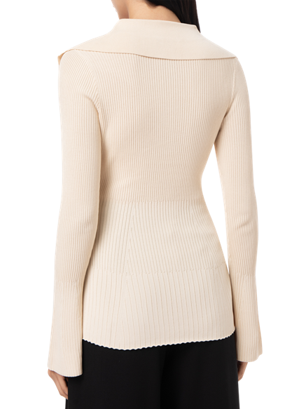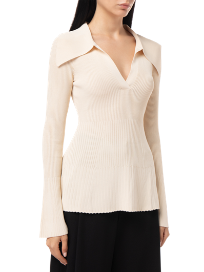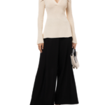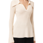 Palmer Harding’s Fracture knit top, made in a technical blend of viscose and nylon, is sure to become your go-to top for the season. The top has a timeless chic aesthetic and is comfortable and flattering. Slim cuffs are flounced to lend it a flirtatious flair, and the body is defined by a gradated rib that creates an extra bit of detail. An attractive touch of allure is provided by the wide flared collar and deep v-cut placket